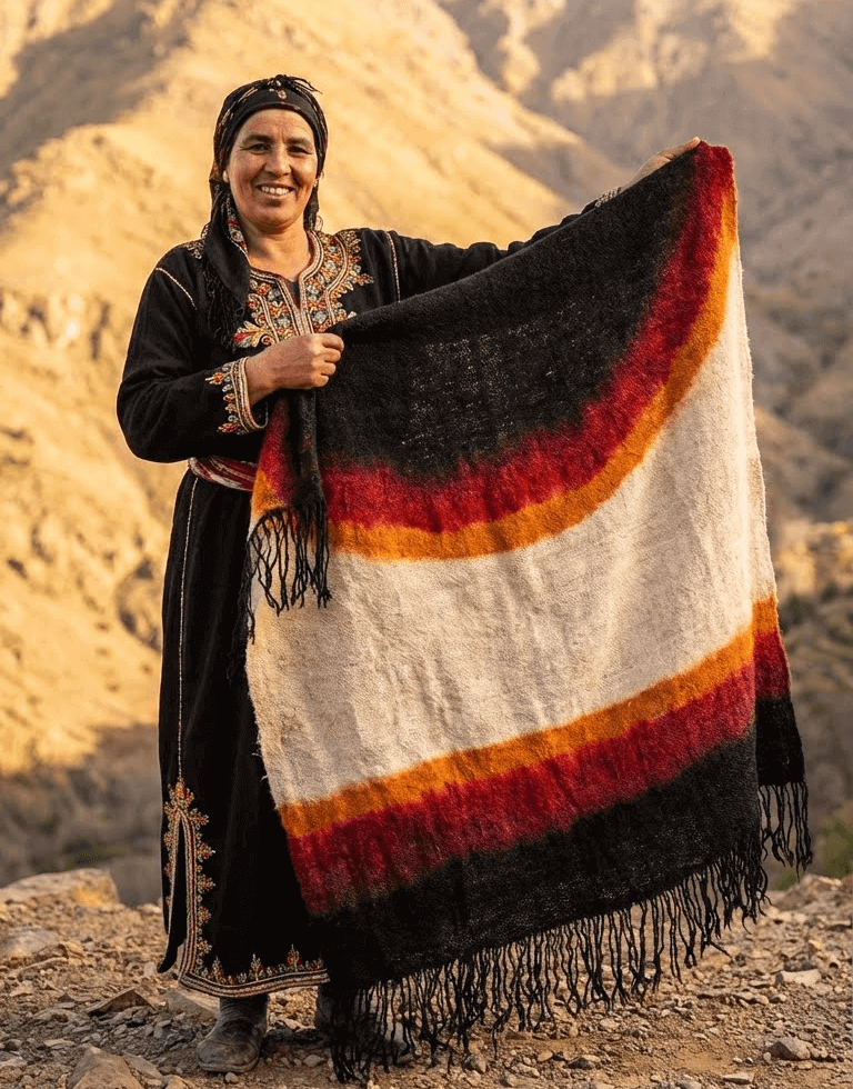 Chaque pièce est unique : laine naturelle, couleurs de la terre, héritage vivant à porter ou exposer.
